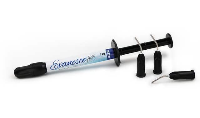 Available in the 1.7g syringe in the most popular shades, EVANESCE FLOW A1, A2 and A3 Enamel shades will satisfy the majority of applications. However, an A4 Universal shade is also available for the aging population; while B1 Enamel and BL1 (Bleach) Universal shades are perfect for younger patients or for those who have previously whitened their teeth. In situations where there are varying degrees of cavity depth or discoloration of the underlying tooth structure, A4 Universal and A2 Dentin shades provide the ability to esthetically mask-out or layer the restoration.