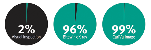 As a result, healthy tooth appears light, and lesions appear dark, giving clinicians a structural view of the lesion whether it’s interproximal occlusal, or around restorations or a crack. As the old saying goes, “What you see is what you get,” or as DEXIS likes to say, “What you see is what is there.” CariVu technology has a very high detection accuracy -- an interproximal dentin caries detection rate of 99 percent. As a result, clinicians can obtain highly accurate diagnostic images in a noninvasive manner with absolutely no ionizing radiation.