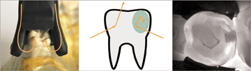 CariVu offers the clinician a precise picture of caries by using near infrared transillumination technology to give clinicians a view of carious lesions and cracks. Flexible “arms” on the end of the device tip straddle the tooth, and near infrared photons are emitted through the arms and travel from the root to the crown of the tooth. Dense enamel reflects the photons while porous lesions trap and absorb the photons.