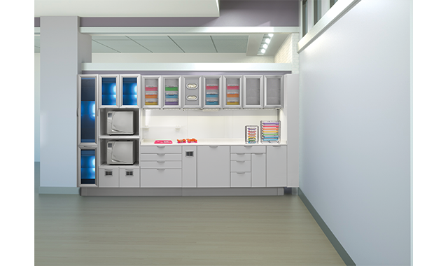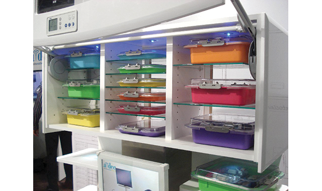As the Color Method recommends, Dr. Brown’s practice utilizes its sterilization center as the bulk storage area for restocking procedure materials into the trays and tubs. All instruments and materials flow through this central hub for reprocessing and restocking. The next day’s procedure set-ups are grouped by color code and staged in racks in the sterilization center for easy retrieval.