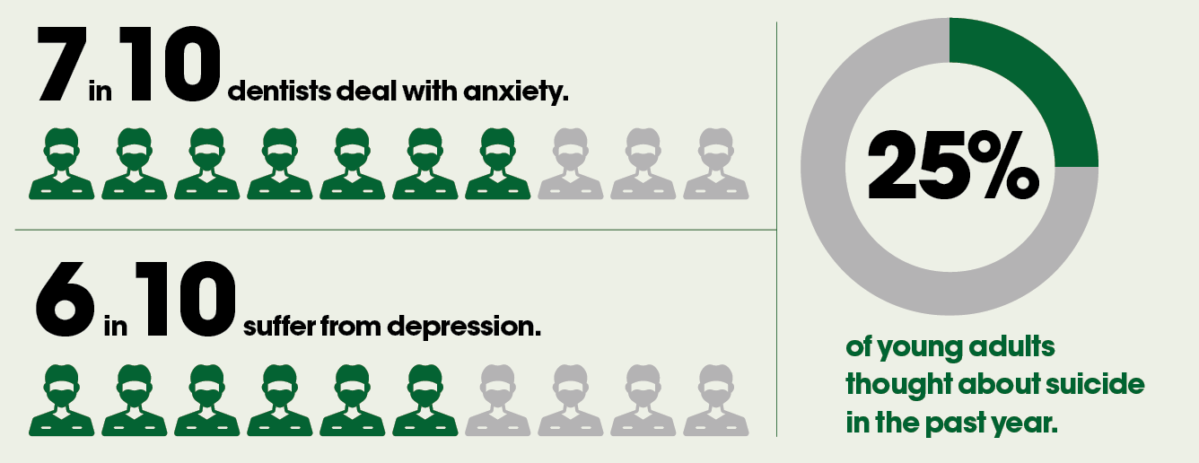 According to the Dental Avengers, a group of mental health advocates in the dental industry, 7 in 10 dentists deal with anxiety and 6 in 10 suffer from depression.1 Most notably, 25% of young adults thought about suicide in the past year.2 Dentists often feel guilty for experiencing mental health challenges when, on the surface, they “have it all”—a great career, family, financial stability, yet their mental well-being still faces challenges. Depression, anxiety, and suicidal thoughts are not restricted by demographics, career paths, or financial status.