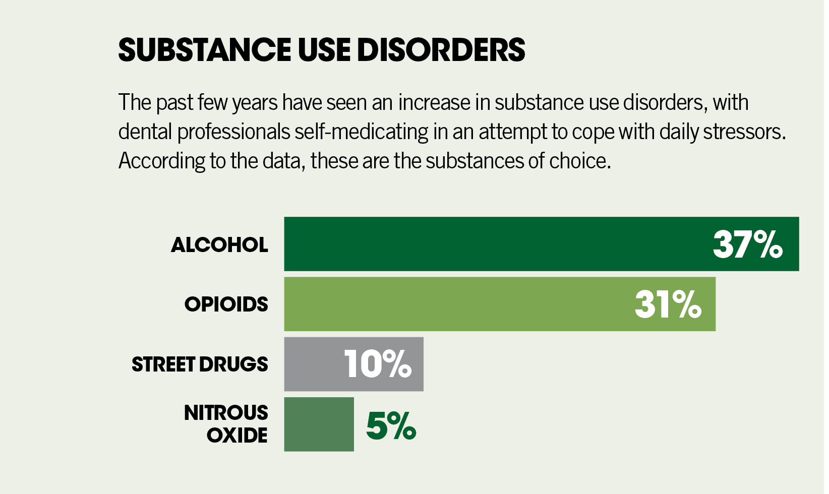 The past few years have seen an increase in substance use disorders, with dental professionals self-medicating in an attempt to cope with daily stressors. According to the data, the substance of choice is alcohol (37%) followed by opioids (31%), street drugs (10%), and nitrous oxide (5%).4 The accessibility of opioids and nitrous oxide within a dental practice makes them a common substance of choice. Dental communities across the country have mourned colleagues who felt isolated and faced addiction alone until they were beyond help.