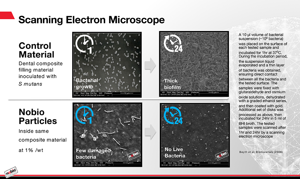 That was an enigma for many years. In vitro studies have demonstrated that composites become rough when they accumulate bacteria on their surface, as the bacteria are capable of using the resin in the composite as a growth medium. By contrast, composites containing Nobio particles did not show this degradation and increased roughness, even under continuous bacterial challenge.
