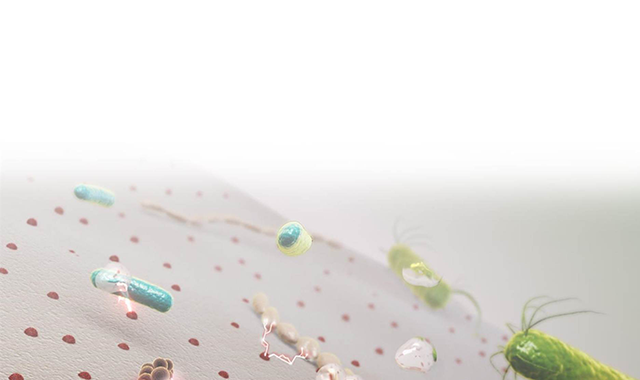 An illustration of the Nobio particles permanently embedded in a material. Each particle is covered with a high concentration of anti-microbial structures that attract and destroy bacteria.