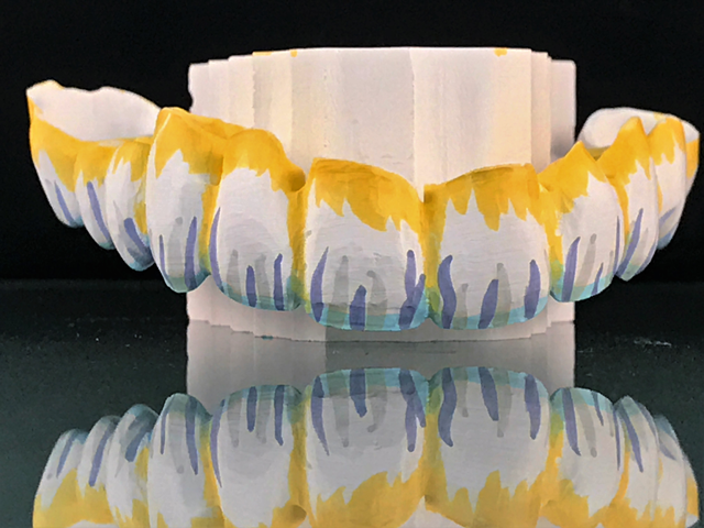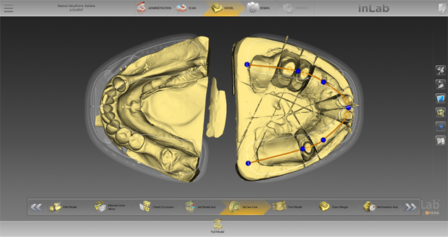 Next, we set the insertion axis or, as I think of it, the “bur axis,” which is the direction the bur will need to be in in order to mill the bridge with no undercuts that may cause a less-than-perfect seating of the bridge (Fig. 16).