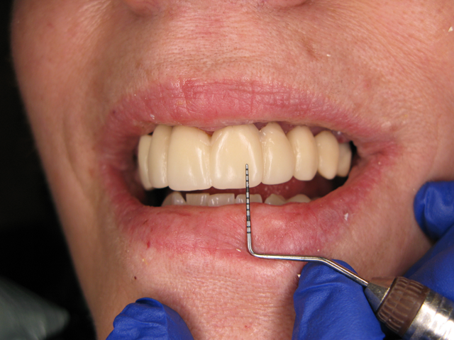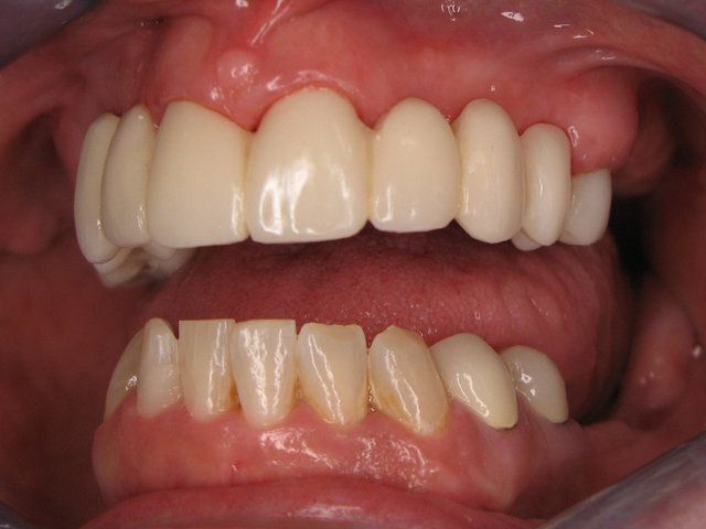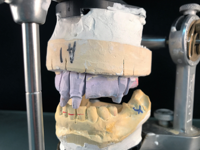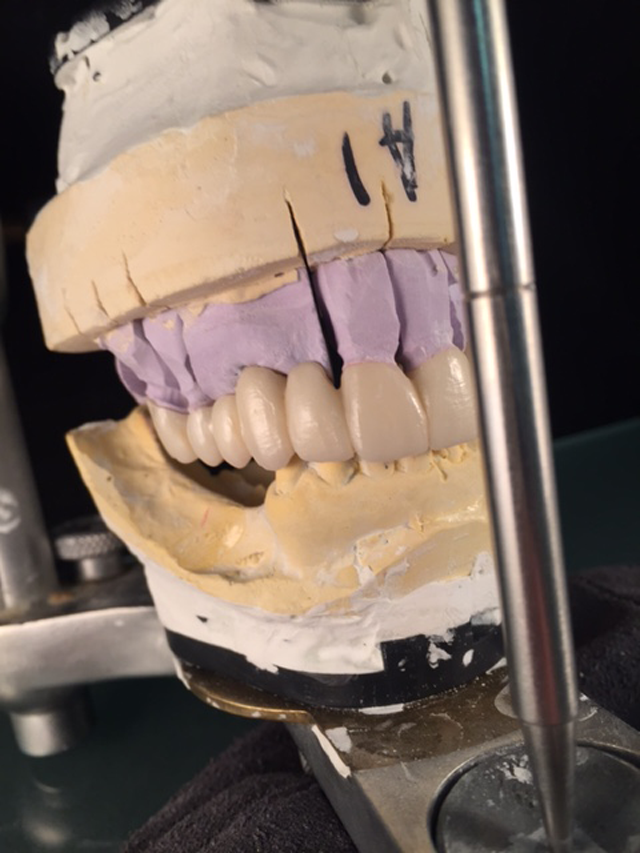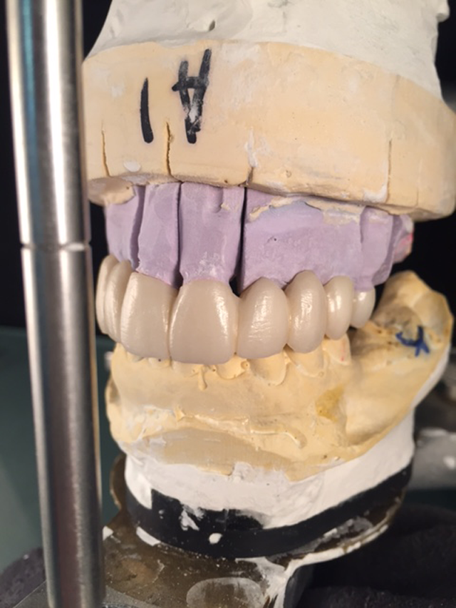The only change that we gathered was needed from the patient was to shorten the front four restorations about 1 mm. (Fig. 4) We later received the final traditional impressions along with a face-bow. We did the model work and articulated on the Hanau™ articulator Face-Bow system. (Fig. 5)
