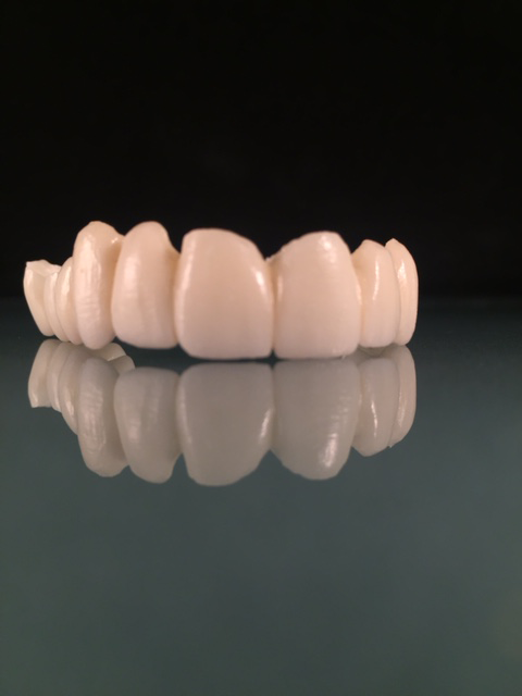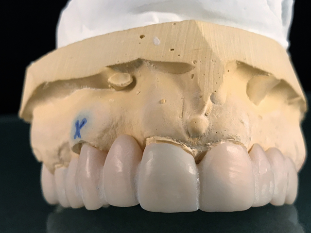 My initial thought was to fabricate two bridges but I did not trust so few abutments and the multiple pontic spans. The doctor and I decided that a round house bridge (full upper restoration) was our best plan for success.