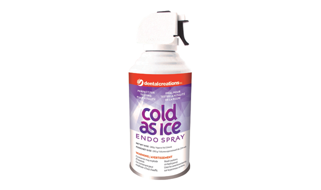 Dental Creations, Ltd. released Cold as Ice Endo Spray, which is reportedly perfect for on-the-spot testing of pulp health. The spray is said to cause a rapid pupal response in vital teeth due to its low liquid temperature of -26.2°C (-15.2°F).