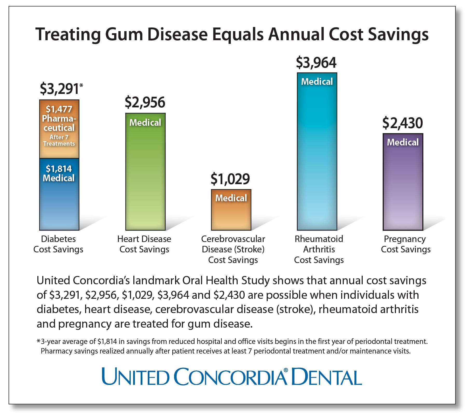 This recent study was sponsored by United Concordia and parent company Highmark, Inc. The accompanying infographic shows the amount of annual health care cost savings possible when an individual with diabetes, heart disease, cerebrovascular disease (stroke), or rheumatoid arthritis, or who is pregnant, is treated for gum disease.