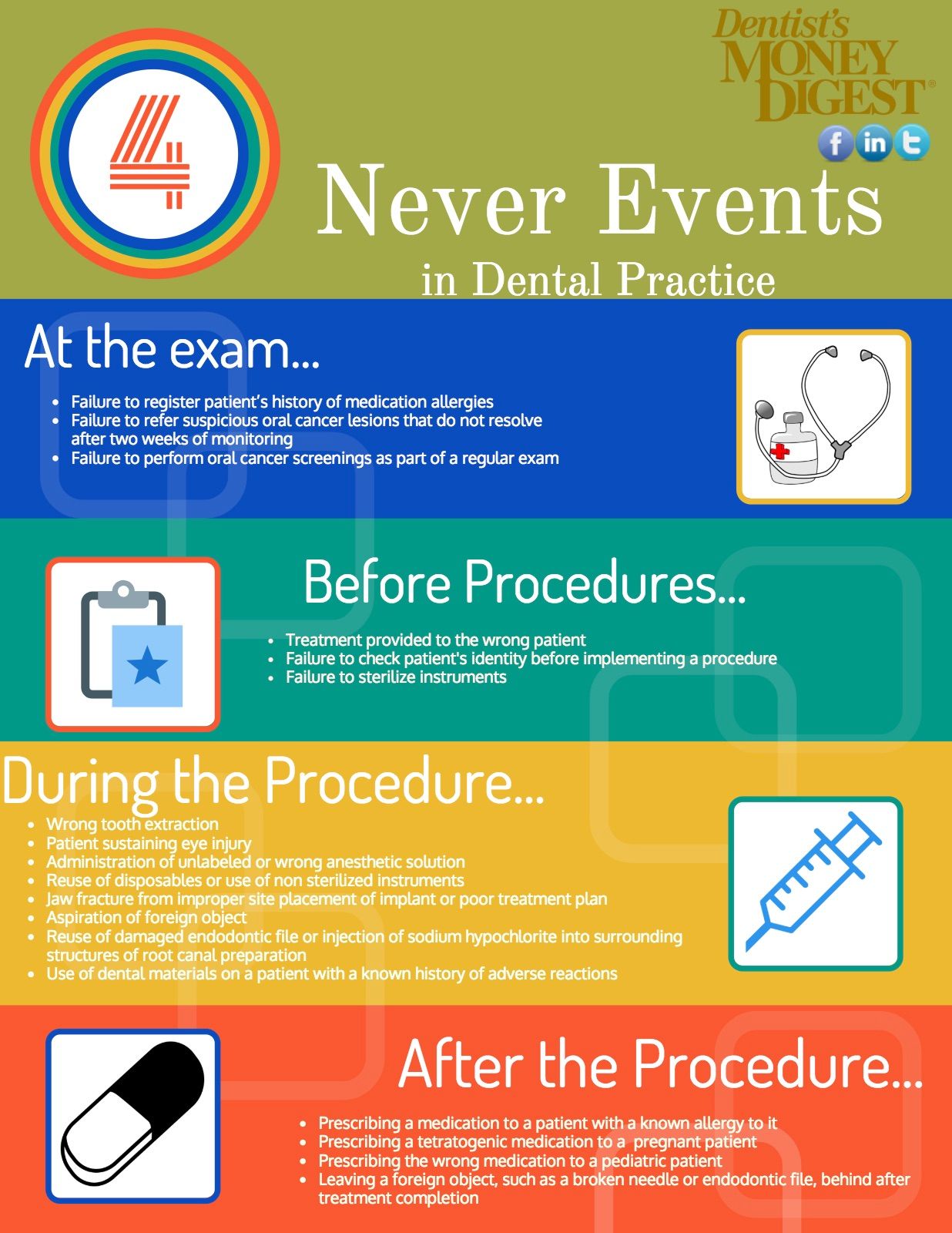 International consensus on the most preventable safety incidents in medicine is compiled into a list of so-called never events. Dental experts have recently gathered a similar list of the worst failures to occur in the practice of dentistry to help guide safety protocols.