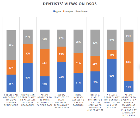 One of the many arguments for DSOs is that they enable dentists to focus on providing better patient care while worrying less about the business side of running a practice. More than half of respondents — 53 percent – considered DSOs a viable option for dentists with limited business acumen, while only 25 percent said DSOs allow dentists to be more attentive to patient care.