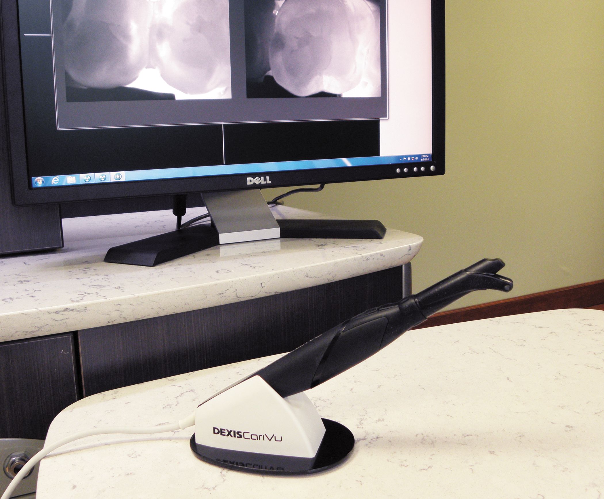 Of course, everyone on my team knows how to take clear, digital X-rays with the Platinum sensor when necessary-it’s fast and easy. The addition of DEXshield [Fig. 1] does not change the workflow at all, but decreases exposure to the patient by 30 percent. We have CariVu ready to go, as well-it’s easy and fast, too, and very portable [Fig. 2]. In most cases, the hygienist can use CariVu to screen the patients during their periodic oral exams in the hygiene room, even before I join them.