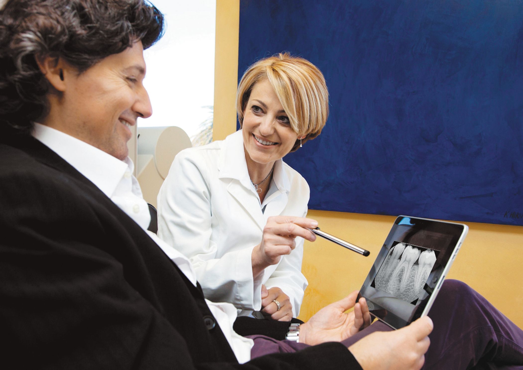 Dr. Brattesani using DEXIS go on her iPad to show her patient the digital x-rays.