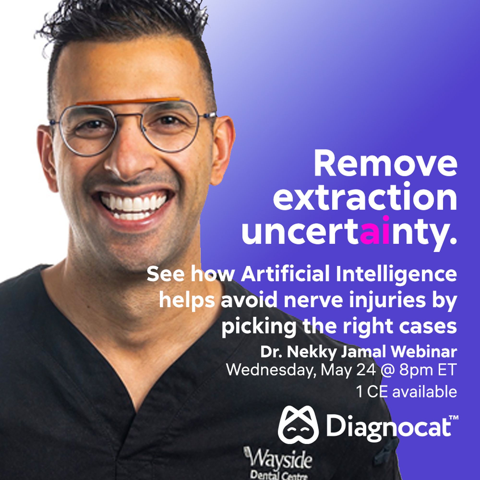 Artificial intelligence (AI) imaging company Diagnocat AI has announced a new webinar on AI and third molar extraction. Slated for Wednesday, May 24th at 8pm EST, this webinar will be hosted by Dr Nekky Jamal and will have 1 continuing education (CE) credit available upon completion. This webinar will also include a live question and answer section afterwards, where participants may ask Dr Jamal their AI, extraction, and nerve injury inquiries.