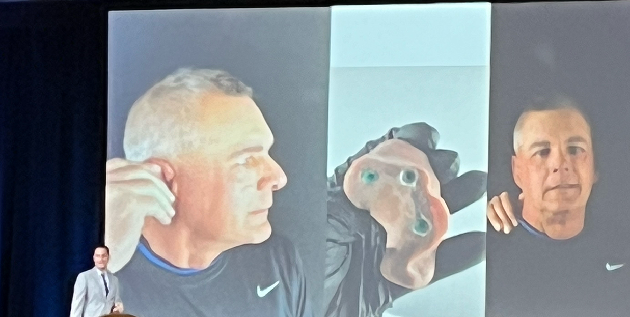 In the final segment of his presentation, Dr Domingue shared a pair of unique challenges he was able to solve with the same digital tools he uses with implant cases. In the first example, he shared the case of a patient who, along with needing dental treatment, was also missing an ear. Dr Domnigue demonstrated how he designed produced and surgically placed several implants with an attachment bar to hold the prosthetic ear in place in the same way fixed removable dentures are retained.
