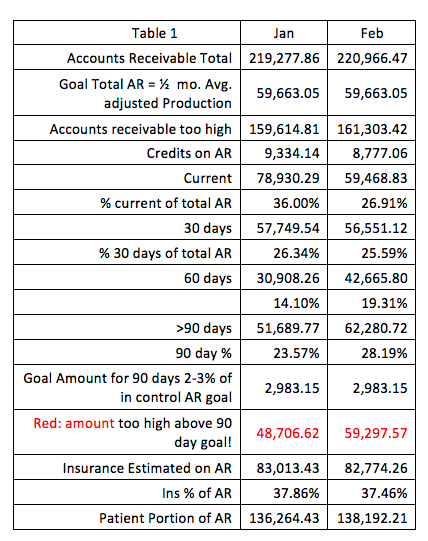 Table one reflects an AR that is very high, well above the goal for this practice. From January to February, the total grew slightly, however, the expectation would have been for the AR to decline because the collections goals would be based on collecting over 100 percent each month to decrease this out of control AR.