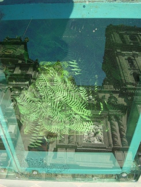 The glass in front of the entrance reflects the doors of the cathedral. Below is the earlier construction upon which the church was built. Tiles that were made in Mexico City from the 17th century are among the artifacts that can be seen.
