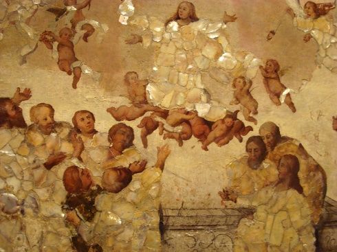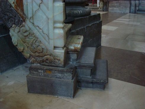 There is more of the unfamiliar inside the church. Due to earthquakes and fires, parts of it were damaged over time. Therefore, what was a stairway to a pulpit made of precious stone had to be reconstructed after one such event. It ended up with the lower supporting structure made of a material much more modest than the more elegant original marble.