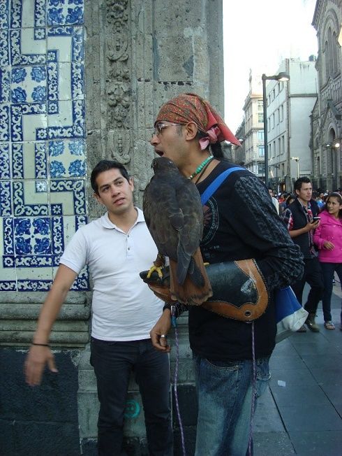 A man in a bandana carries a hawk. Notice the blue and white tiles on the building in the background on the left of old Mexican origin.