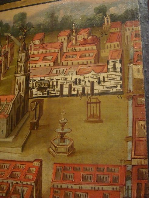 The Zócalo (central plaza) painted on an early screen. The Cathedral is on the left.