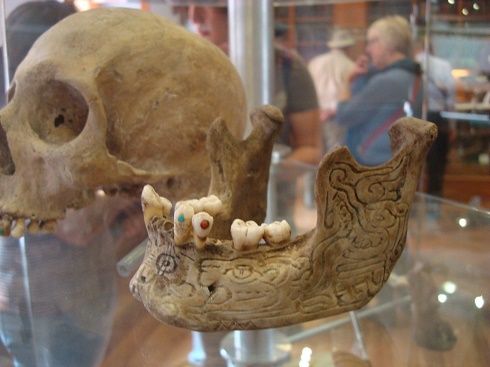Prehistoric Mayan and Aztec fillings were precious jewels. After death, the jaw bones were incised as shown here. The Hall of Mexican Dentistry, Mexico City.