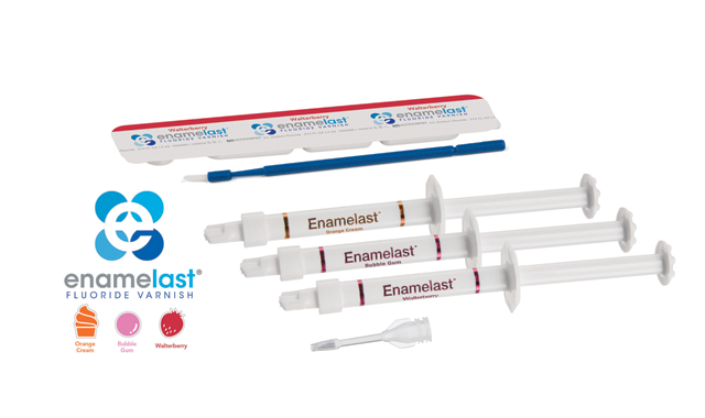 Ultradent’s enamelast is a flavored fluoride varnish. It is nearly invisible when applied properly and employs a patented adhesion-promoting agent for enhanced retention, providing fluoride release and uptake. It is available in four flavors in either unit-dose or syringe application.