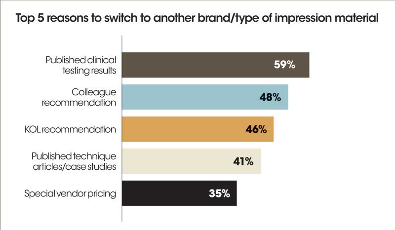 What we learned was that 67% of survey respondents said published clinical testing results would motivate them to switch brands, while just more than half are influenced by key opinion leaders (52%) and a colleague's recommendation (51%). Almost half (48%) indicated that published technique articles/case studies can motivate clinicians to try another material, while special vendor pricing sways 29%.
