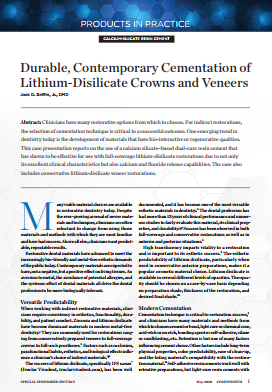 This case presentation reports on the use of a calcium silicate–based dual-cure resin cement that has shown to be effective for use with full-coverage lithium-disilicate restorations due to not only its excellent clinical characteristics but also calcium and fluoride release capabilities. The case also includes conservative lithium-disilicate veneer restorations.