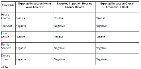 Gudell said the economists surveyed tended to favor candidates with more centrist approaches. Economists were asked to predict whether a given candidate’s election would have a positive, neutral, or negative impact on three economic factors: home values, housing finance reform, and overall economic outlook.