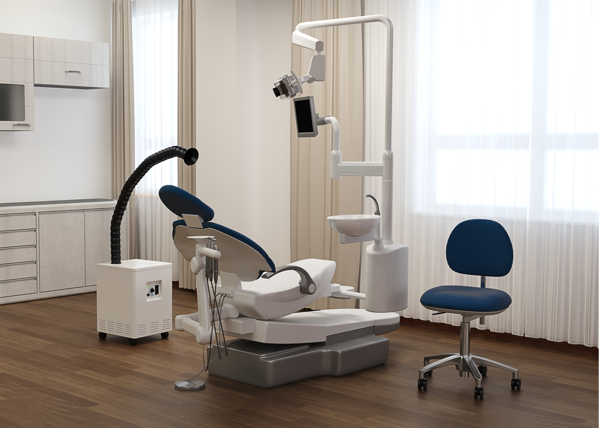 The Source Capture System is a standalone air purifier with a suction hose that captures the airborne pathogens and droplets that may escape from a patient’s oral cavity during a procedure. It uses a patented earth mineral technology in a “direct point of source” system.