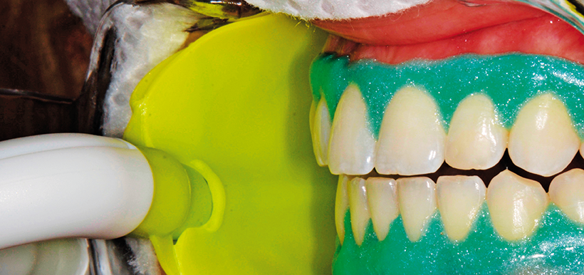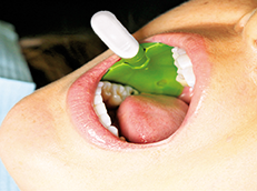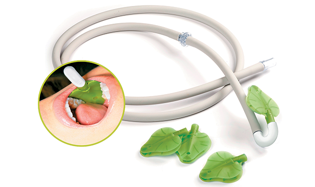 4. Place Ivory ReLeaf into the patient’s oral cavity with the leaf positioned between the teeth and cheek. When transitioning between patients, remove the quick-disconnect hose, wipe down the short eight-inch hose with a disinfectant wipe, reattach the hose to the adapter, and then attach a new leaf.