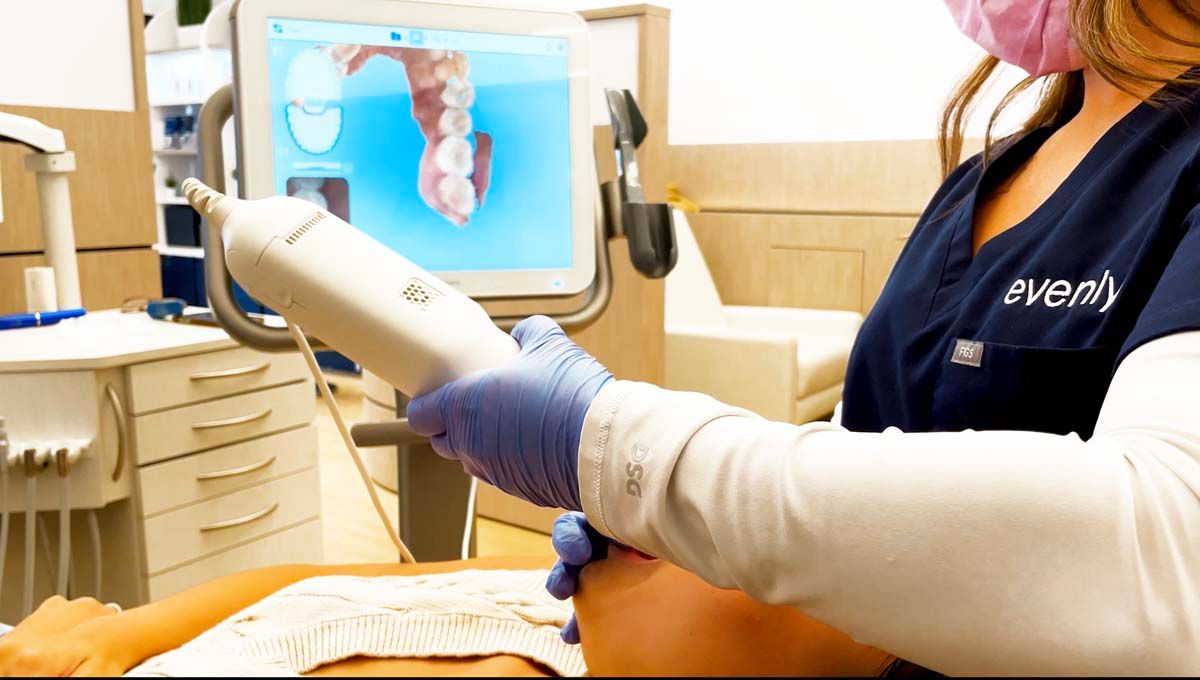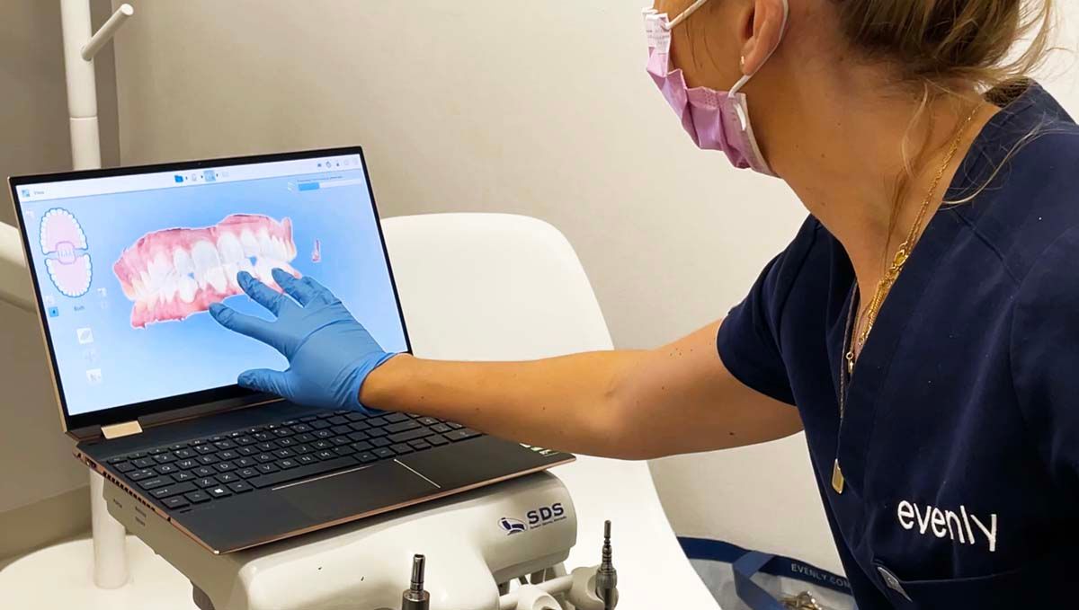 Evenly’s expert treatment coordinator (TC) comes to each dental office equipped with a portable scanner and provides a free consultation to every patient, including a 3D scan, and then presents a treatment projection overseen by Evenly’s expert orthodontists. The TC is in communication with an orthodontist as needed. The Evenly orthodontist creates a custom clear aligner orthodontic treatment plan and Evenly delivers the aligners to the patient at the dental office and guides interproximal reduction and attachments. Then Evenly sets the patient up on a remote management platform for convenient weekly check-ins with the Evenly team. At the end of treatment, Evenly provides treatment closeout and free retainers.