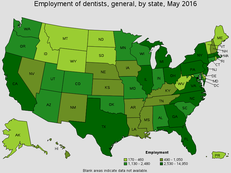 Employment of dentists is strong, particularly in large states like Texas and California. However, the states with the highest concentration of jobs and location quotients in dentistry differ. New Mexico, Michigan, California, Massachusetts and Arizona boast the highest number of jobs relative to population size. Employment per thousand jobs for these states stands at .97, .95, .94, .93 and .93, respectively.