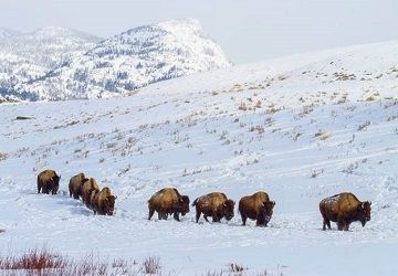 In winter, balls of snow dangle from the bison’s shaggy coats and the beasts’ breath hangs in the frigid air like fire, making the formidable animals look even more impressive.