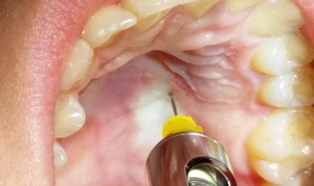 The drawbacks to this approach are important to consider as well. Due to the dense palatal tissue, manual deposition can take longer than expected and the clinician may develop hand fatigue. Also, incomplete anesthesia with the central incisors due to cross-over innervation are of concern. Depositing more anesthetic using the infiltration technique easily remedies this problem.