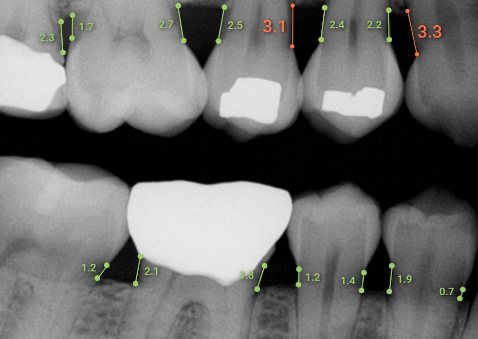 In clinical performance testing, Overjet Dental Assist demonstrated automated measurement capabilities comparable to a team of highly skilled dentists. Overjet had 3 experienced dentists independently measure bone levels on dental radiographs using a measuring tool. These measurements were then further adjudicated by an oral radiologist to establish an official consensus ground truth. Overjet’s AI-powered Dental Assist measurements were then compared against this dentist consensus and had an average difference of only 0.3mm.