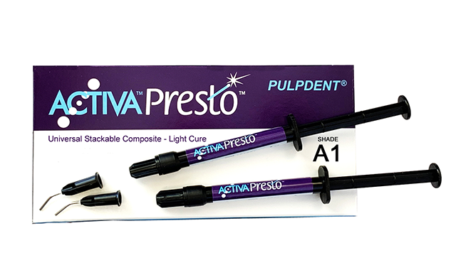 Designed to mimic the properties of natural teeth, ACTIVA Presto is a white filling material featuring a moisture-friendly resin said to promote the diffusion of bioavailable calcium, phosphate, and fluoride ions. The material’s chemistry reportedly penetrates and integrates with tooth structure for adaptation without margins. It also features a patented rubberized-resin designed to absorb stress and protect against wear, fracture, and chipping. Highly radiopaque, ACTIVA Presto is a stackable composite that resists slumping, and it is indicated for all cavity classes and available in a variety of shades, including cervical shades.