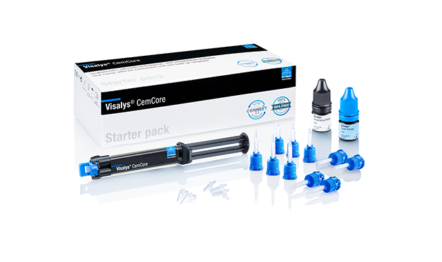 The Visalys CemCore system enables both adhesive cementation and core build-up to be achieved with just a few components. Active-Connect-Technology allows optimal mixing of the somewhat hydrophobic cementation composite, Visalys CemCore, with the hydrophilic Visalys® Tooth Primer, on the damp surface of the tooth. The composite achieves a high adhesive strength without swelling. Visalys CemCore is formulated to flow superbly into every clearance, and yet displays a high degree of stability. Release the pressure, and Visalys CemCore reverts to its firm consistency so excess material does not expand and is easy to remove after application.