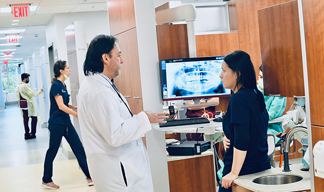The dental clinics at TSDM feature all of the latest technologies. Here, Dr. Chris Walinski works with a student on a case using CBCT.