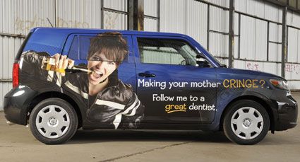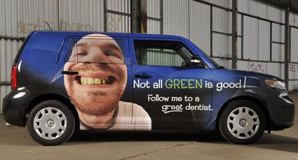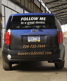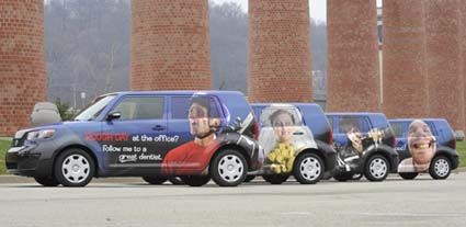 Grabbing the attention of the public, raising public awareness of the benefits of dental health, delivering new patients to clients and, all the while, cutting delivery costs is what one laboratory in Pennsylvania has managed to do with their new fleet of delivery cars. Wrapped with humerous images and relatable messaging, the delivery cars of Maverick Dental Laboratory attract the attention of consumers with their “Follow me to a great dentist” creative marketing campaign as they deliver crowns and bridges to local dentists throughout southwestern Penn.