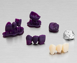 Crown and bridge patterns printed in Formlabs Castable Wax Resin, alongside finished parts: a full metal crown and a pressed lithium disilicate bridge