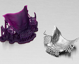A removable partial denture pattern 3D printed in Castable Wax Resin (left) and the final cast cobalt-chromium frame (right).