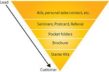 The inverted pyramid contains all the marketing pieces you could use to gain a prospect’s attention. The top row is bigger meaning there are more touch points (contact with potential customers) such as ads, sales calls or others. As you move down, you will notice that you will need less and less marketing materials. Early in the sales process you might entice someone with product information, and as you move down to the apex of the pyramid you will need more specific information to answer the question: Why should I use your laboratory?