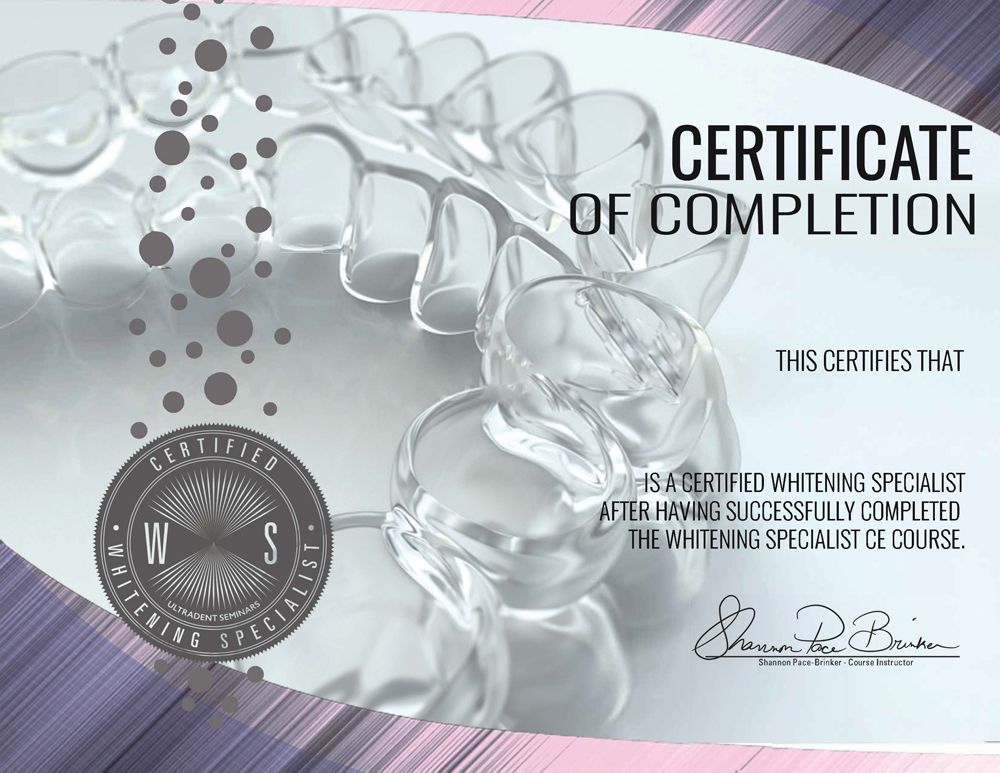 Certifications—such as the one shown here—indicate who is certified to serve as a whitening specialist.