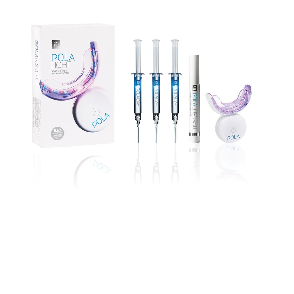 The Pola Light system comes with either Pola Day 9.5% hydrogen peroxide or Pola Night 22% carbamide peroxide gel, and it is easy and comfortable to use at home. The gels are fast acting and formulated to safely remove long-term stains in as little as 5 days. The high viscosity, neutral pH tooth whitening gel ensures patient comfort. The unique blend of soothers, conditioners, and high-water content also assists in reducing sensitivity.