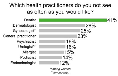 According to the survey, 41 percent of American adults reported they do not get to the dentist as often as they'd like, coming out 13 percent higher than the next health practitioner, dermatologists at 28 percent.