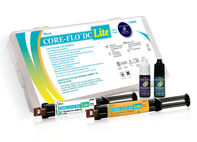 CORE-FLO DC LITE is a dual-cured, radiopaque, fluoride-containing core material. CORE-FLO DC LITE is indicated for core build-up, post cementation and as a dentin-replacement material. It is a self-leveling low viscosity material said to be perfect for cases where a band may be required, lower viscosity is desired or initial subgingival margins are present and not visible (e.g. fractured cusp). CORE-FLO DC LITE’s compressive and flexural strength is designed to offer the clinician reliability and durability when fabricating direct restorations.