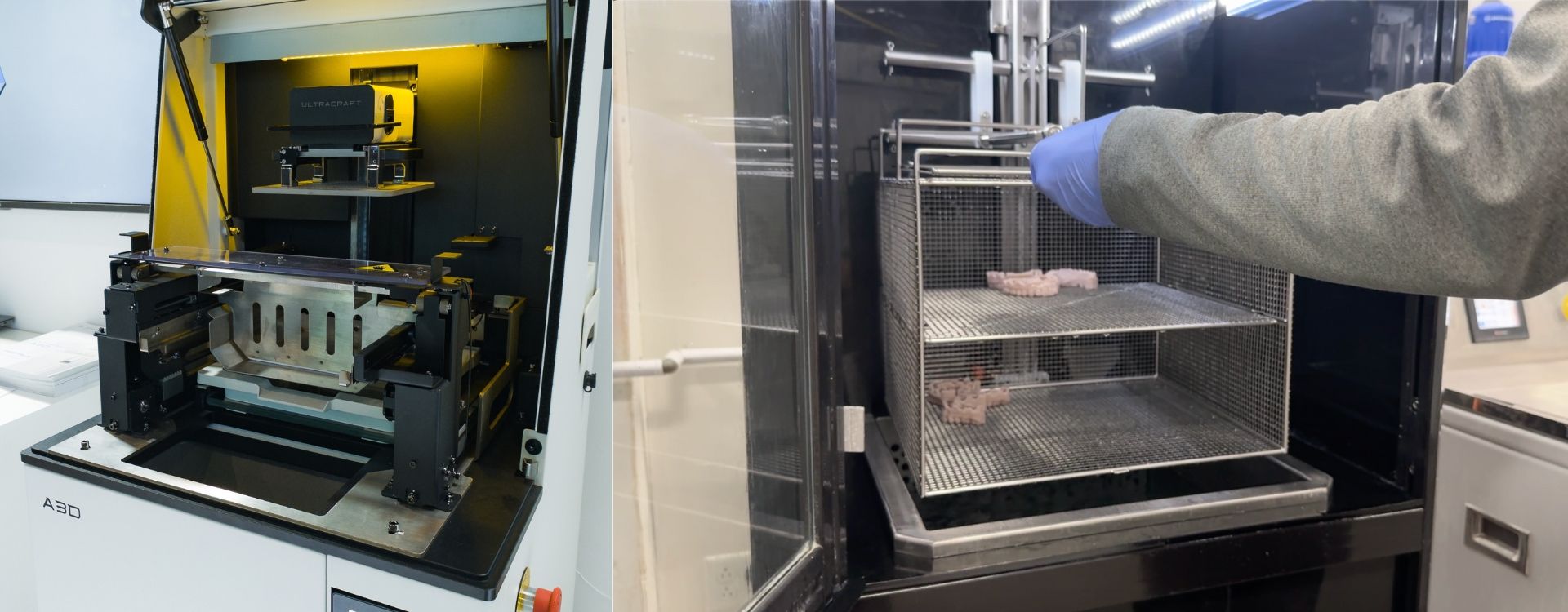 3D printing solutions from HeyGears such as the UltraCrraft A3D printer are designed for automated production. Combining this with PostProcess’ solutions can add efficiencies to the workflow, such as by eliminating the need for use of isopropyl alcohol in the resin removal process via PostProcess’ patented AUX-400-RINSE. This step is also designed to improve the safety of dental 3D printing workflows.