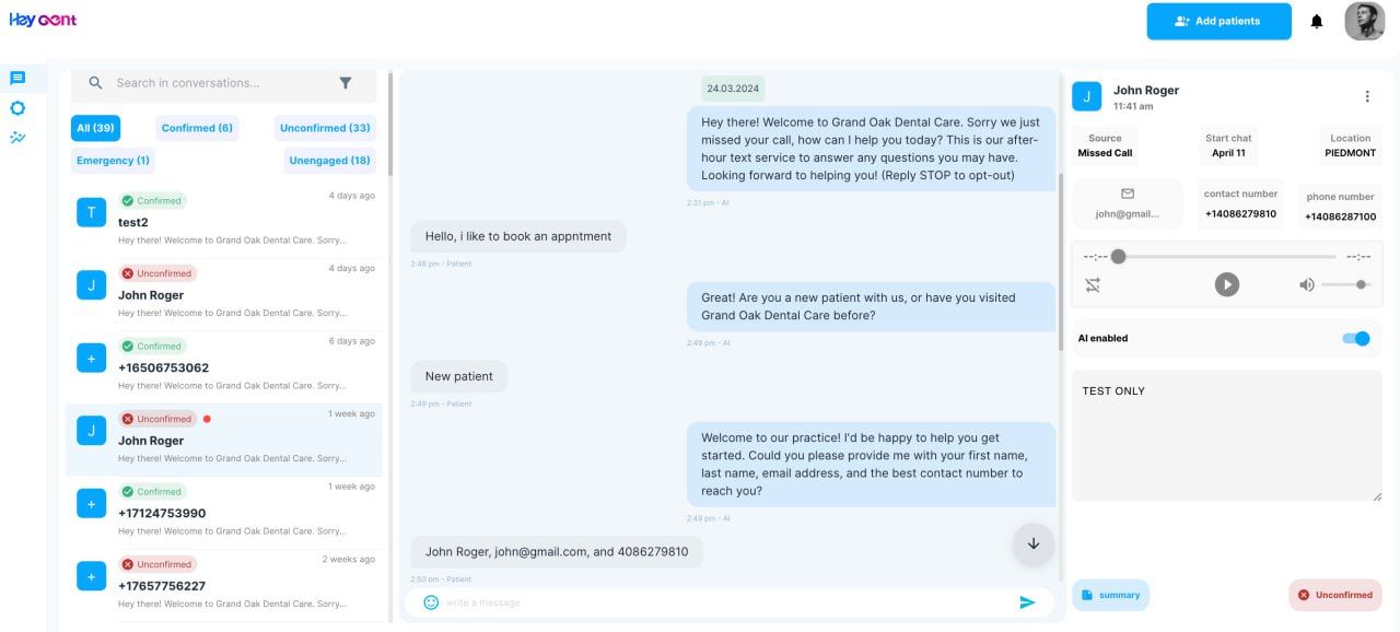 The user-friendly patient conversation management dashboard is designed to give the dental practice full control. Key features include reviewing text message transcripts with AI-produced summaries, confirming appointments, filtering conversations, and enabling 2-way messaging with AI-enabled emergency care detection and notifications. The Heygent conversational Dental AI is poised to change the way dental practices engage with their patients, providing optimal convenience, efficiency, and support.