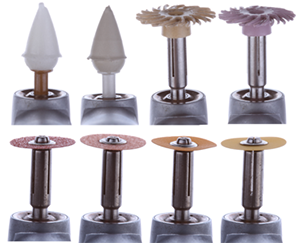 Following the shaping and smoothing of restorations that occurs with a bur, they are then finished and polished. Finishing is the recontouring of a restoration whereas polishing is removing surface irregularities. There are various shapes and formulations of composite finishing and polishing tips (Fig. 8). They all typically contain either aluminum oxide or diamond abrasives. Diamonds are harder and more abrasive than aluminum oxide.
